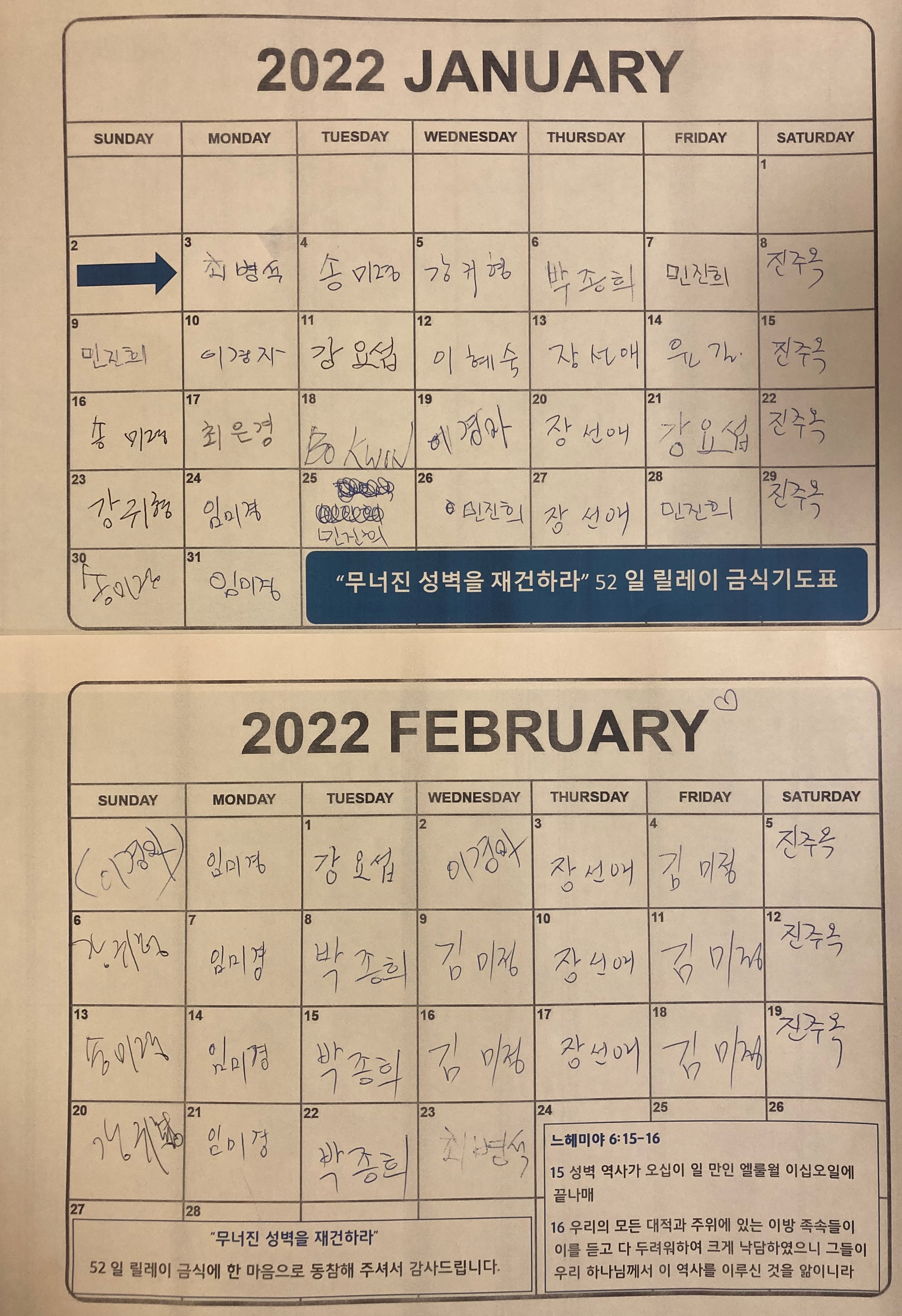 2022년 "무너진 성벽을 재건하라" 하루 한끼 릴레이 금식 기도를 은혜가운데 마쳤습니다.